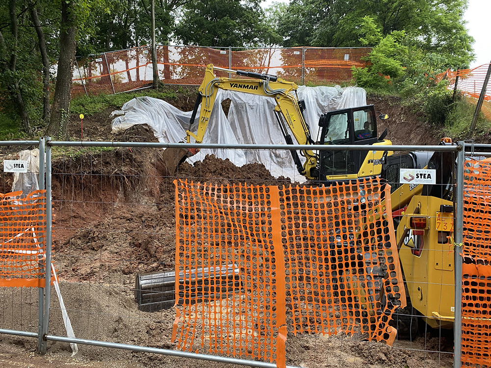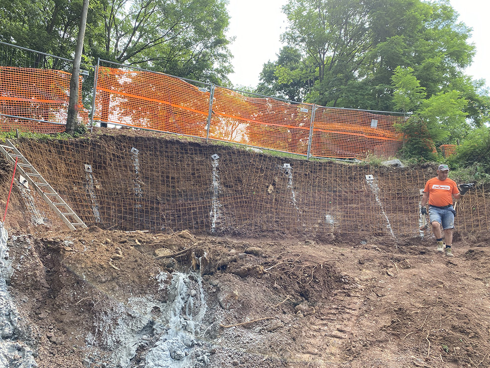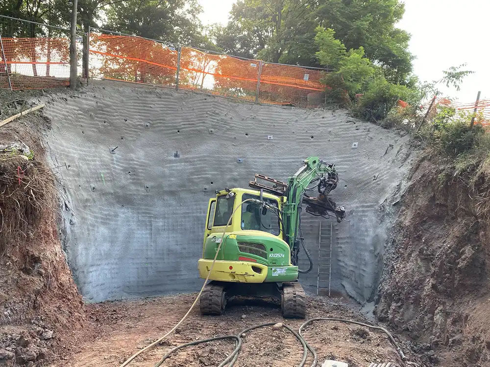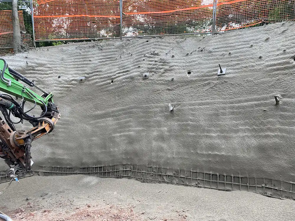 Si è provveduto pertanto alla riprofilatura della scarpata come richiesto in fasce di circa 2,5ml di altezza per poi consolidarle con autoperforanti e spritz beton il pendio.