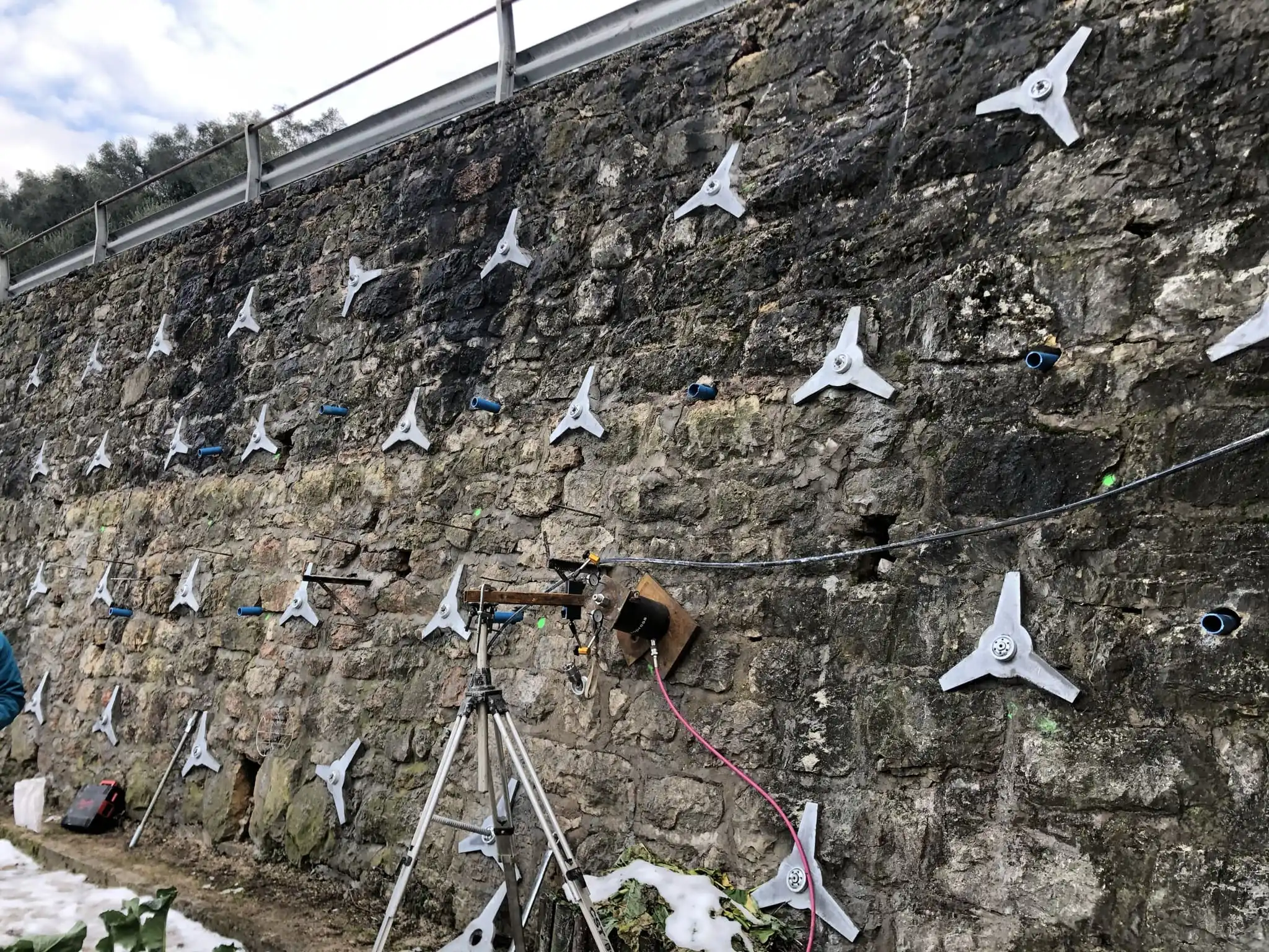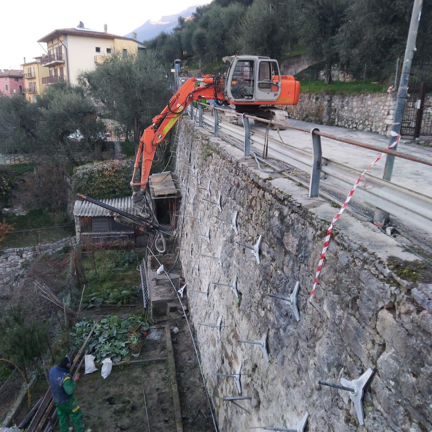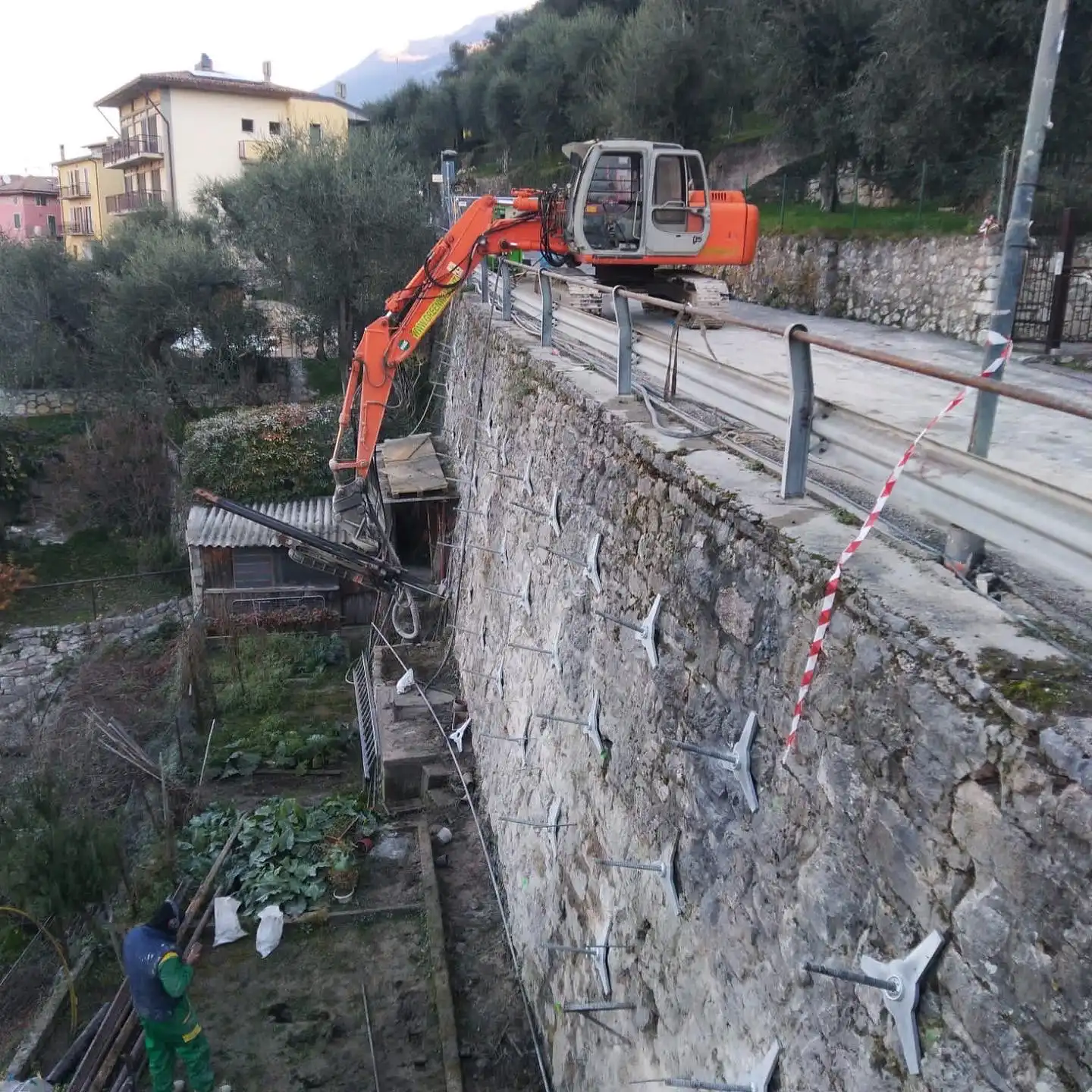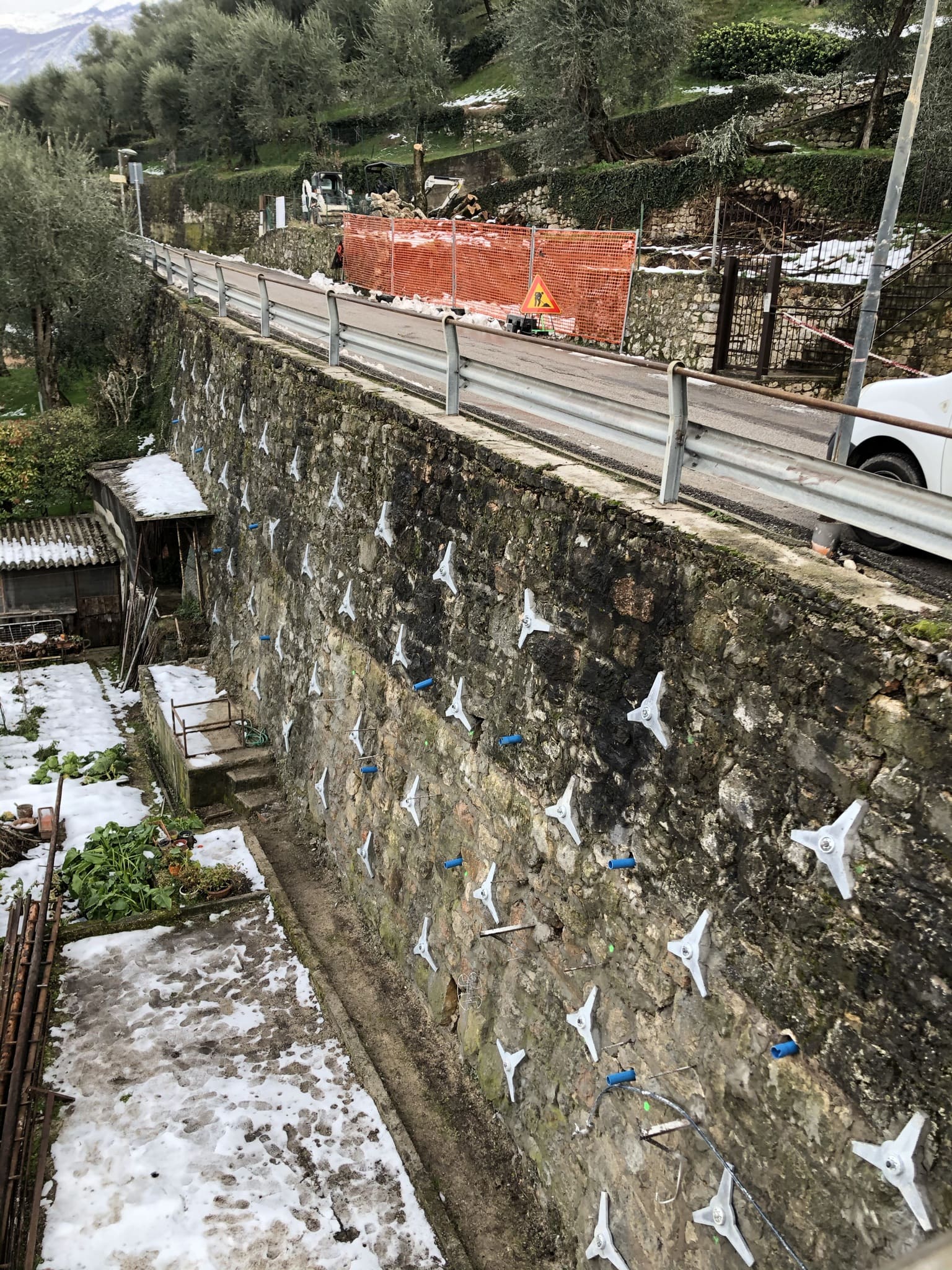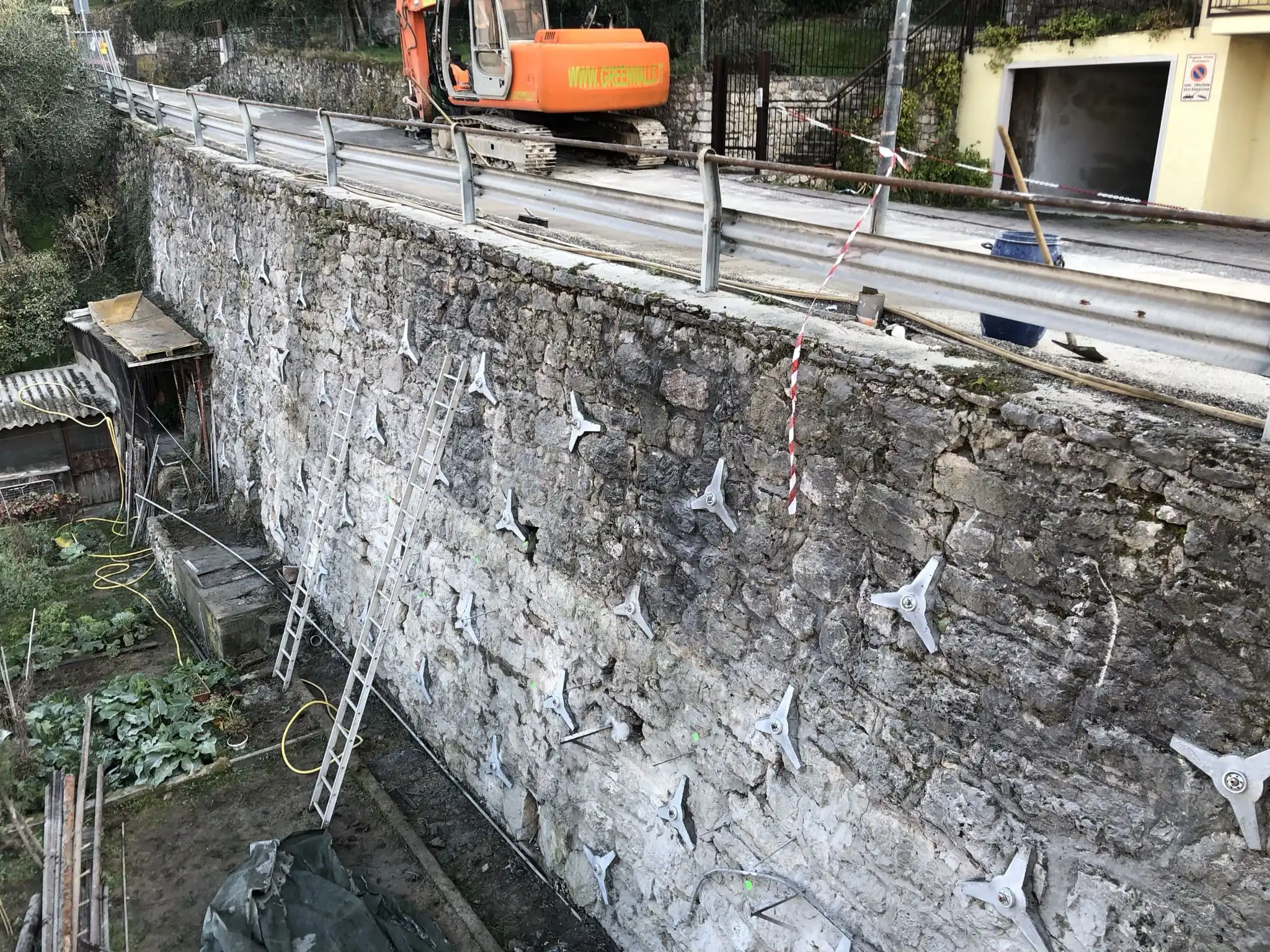 Il lavoro prevede il consolidamento di un muro alto circa 5ml con 3 file di tiranti autoperforanti di lunghezze 8ml, 10ml e 12ml.