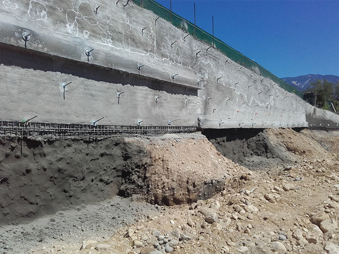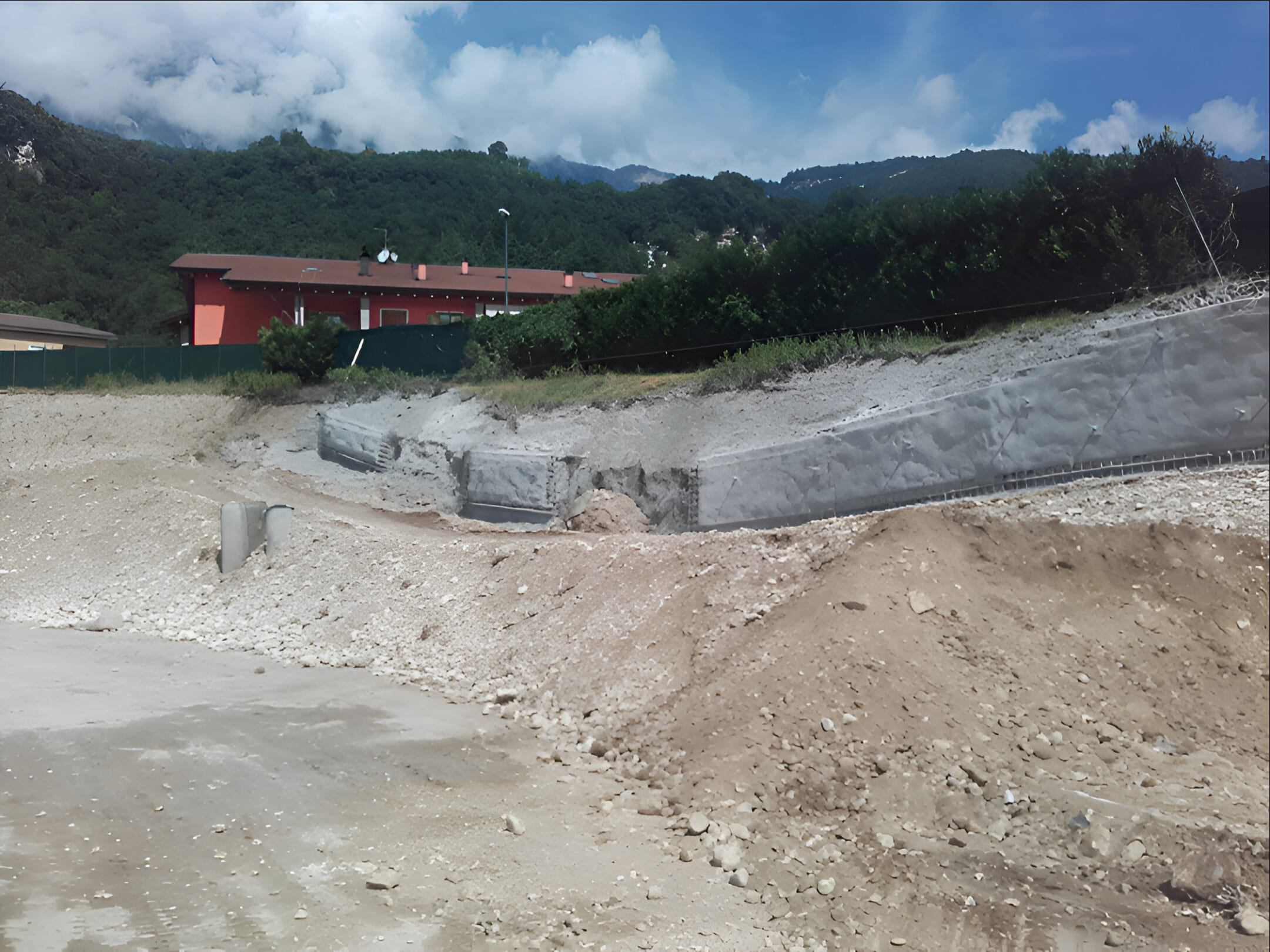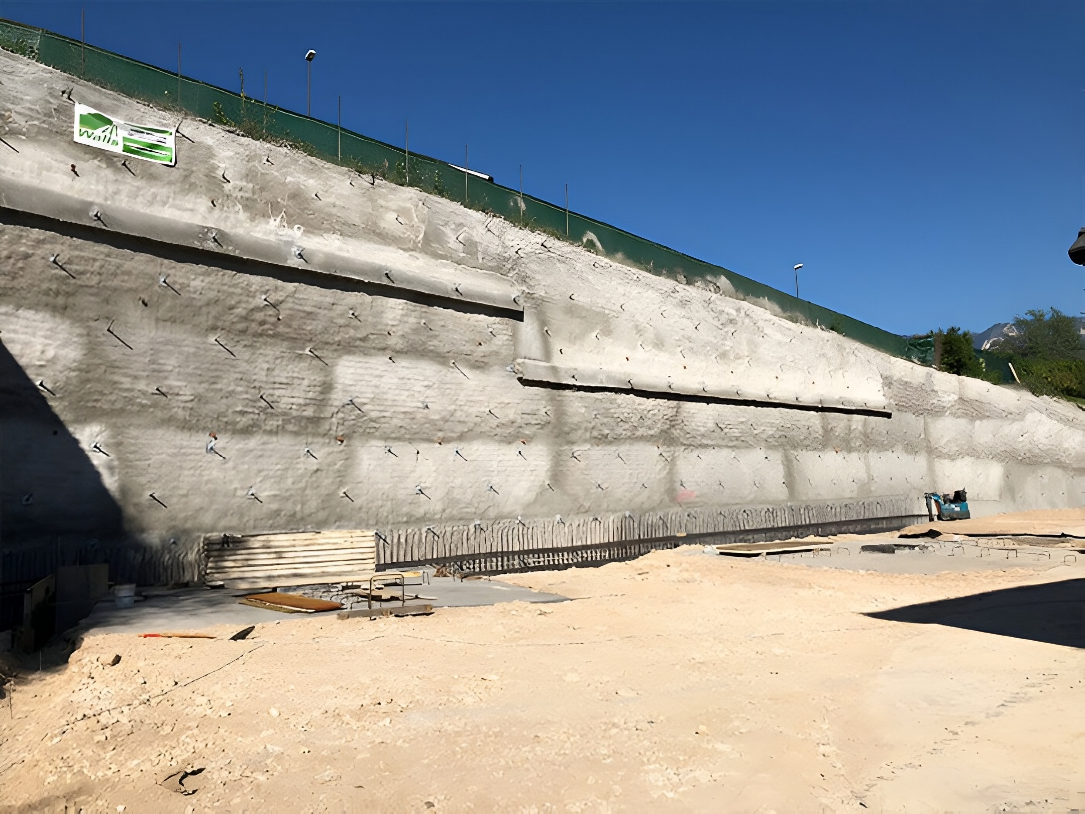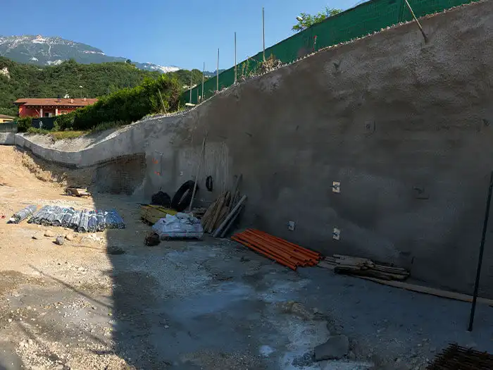 La parete verticale nel punto più alto ha raggiunto gli 11,50ml di altezza, dove sono stati inseriti, in aggiunta alla normale armatura, 2 cordoli in calcestruzzo i quali sono stati sostenuti con barre autoperforanti zincate rese attive per consentire una maggiore rigidità della parete.